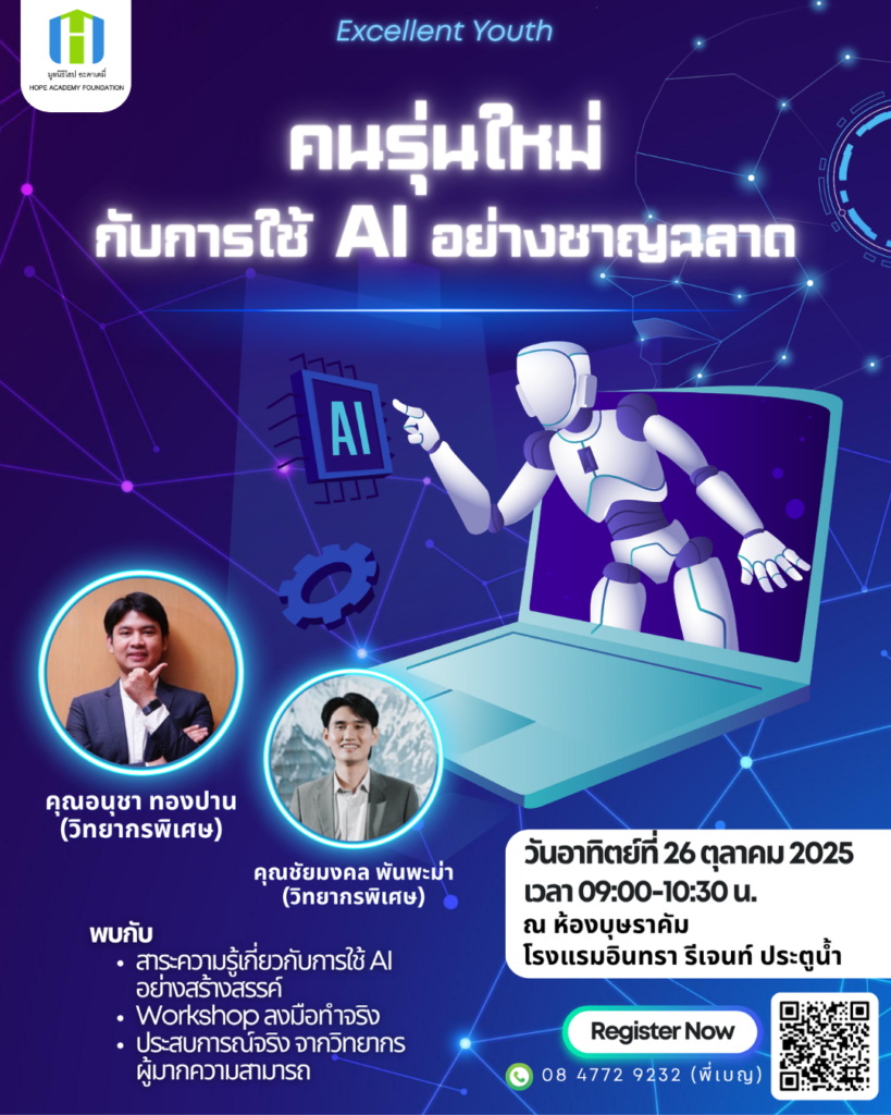 มูลนิธิโฮป อะคาเดมี่ ขอเชิญร่วมนักเรียน นักศึกษา หรือผู้สนใจอบรมพัฒนาทักษะด้าน AI โดยกลุ่ม 📣 Excellent Youth กับหัวข้อ