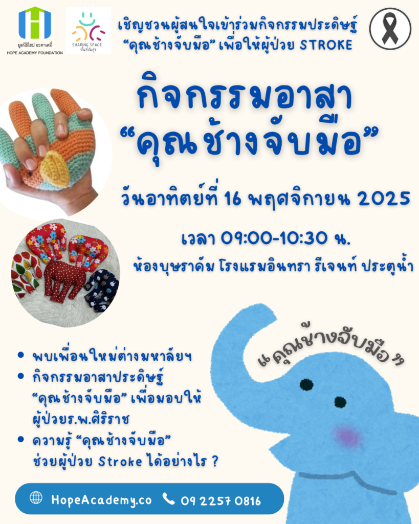 มูลนิธิโฮปอะคาเดมี ร่วมกับ Sharing Space ชวนผู้สนใจเข้าร่วมกิจกรรมประดิษฐ์ “คุณช้างจับมือ” เพื่อให้ผู้ป่วยโรคหลอดเลือดสมอง (Stroke)